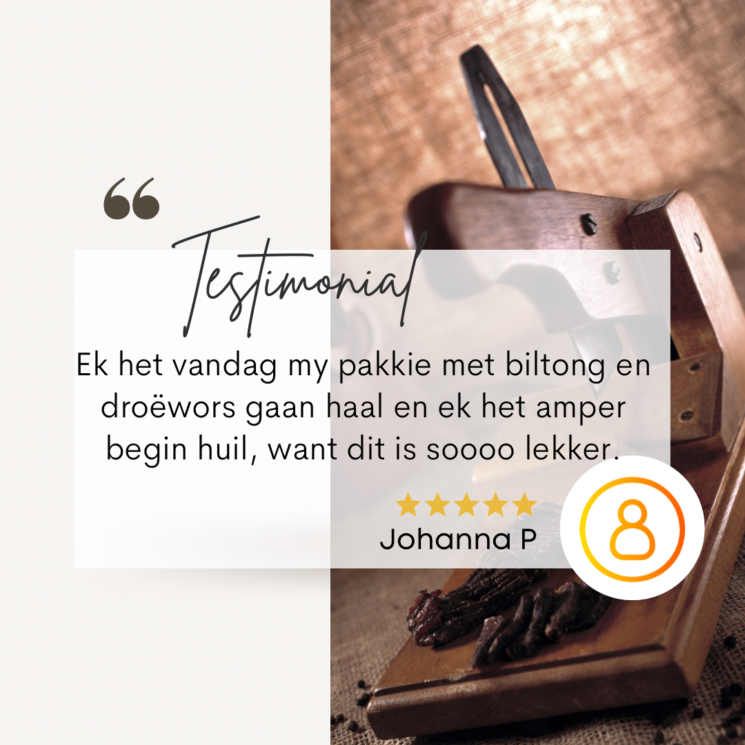 I recently ordered for the first time at short notice, and my "biltong & droewors" was delivered swiftly at my hotel room in Vancouver, without any delays or problems! The owner called me personally to confirm the delivery. Thank you for the great service, and tasty products! Go Bokke!