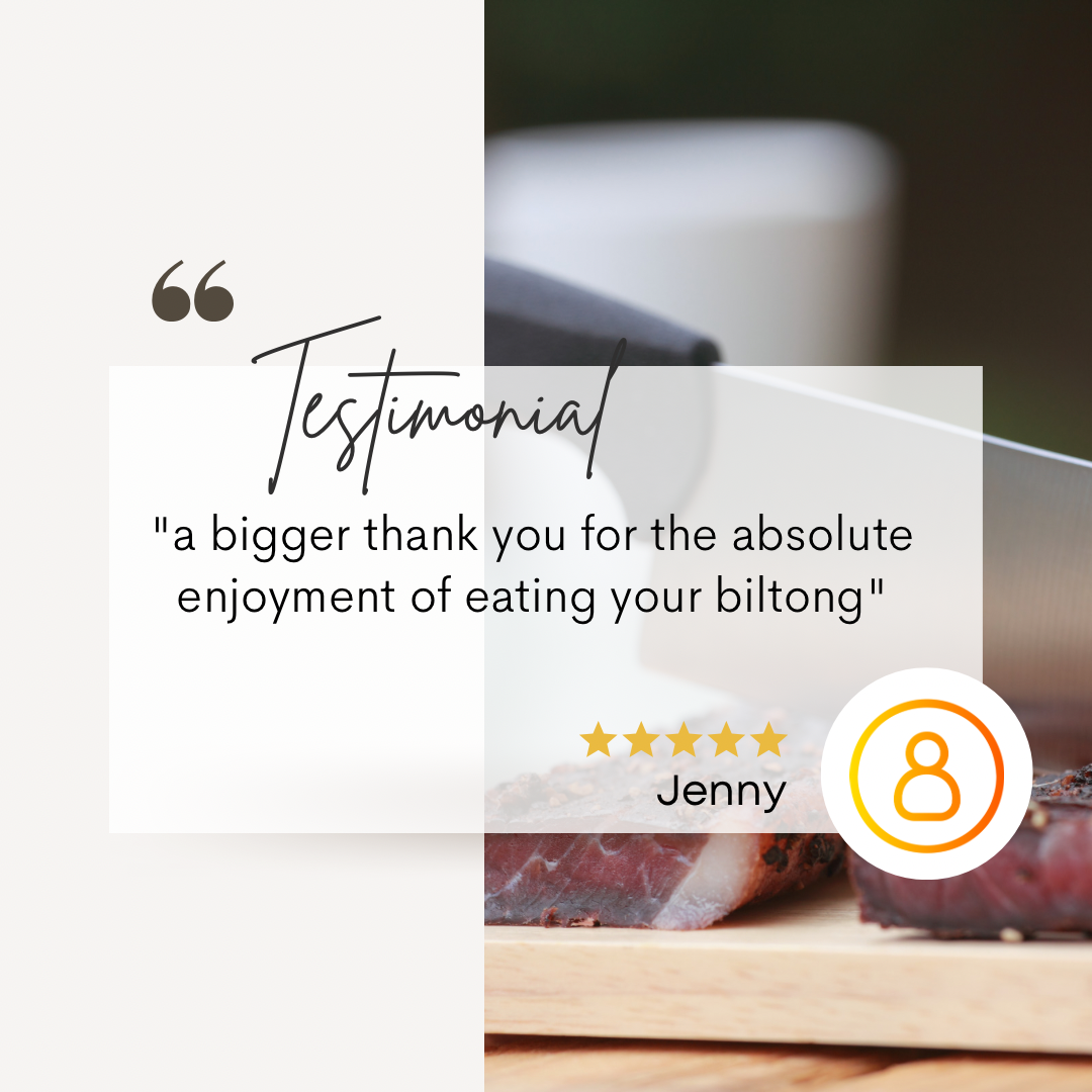 The biltong is perfect! On the website, its very easy to choose fatty or lean, whatever one’s preference is! The mixture of spices, is right-on making it very flavourful and ‘moreish’, where Ione always want more :) Good job, Paul!